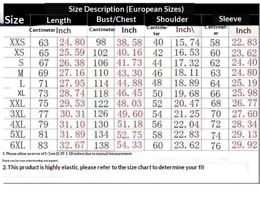 Sizes: XS, S, M, L, XL, 2XL, 3XL, 4XL, 5XL, 6XL